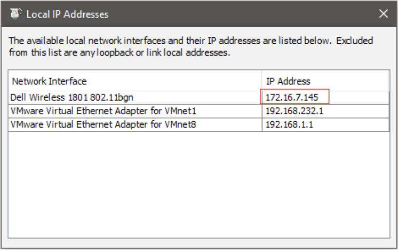菜单:Help >> Local IP Address >> 可以看到本机的IP地址。正常安装完软件之后,