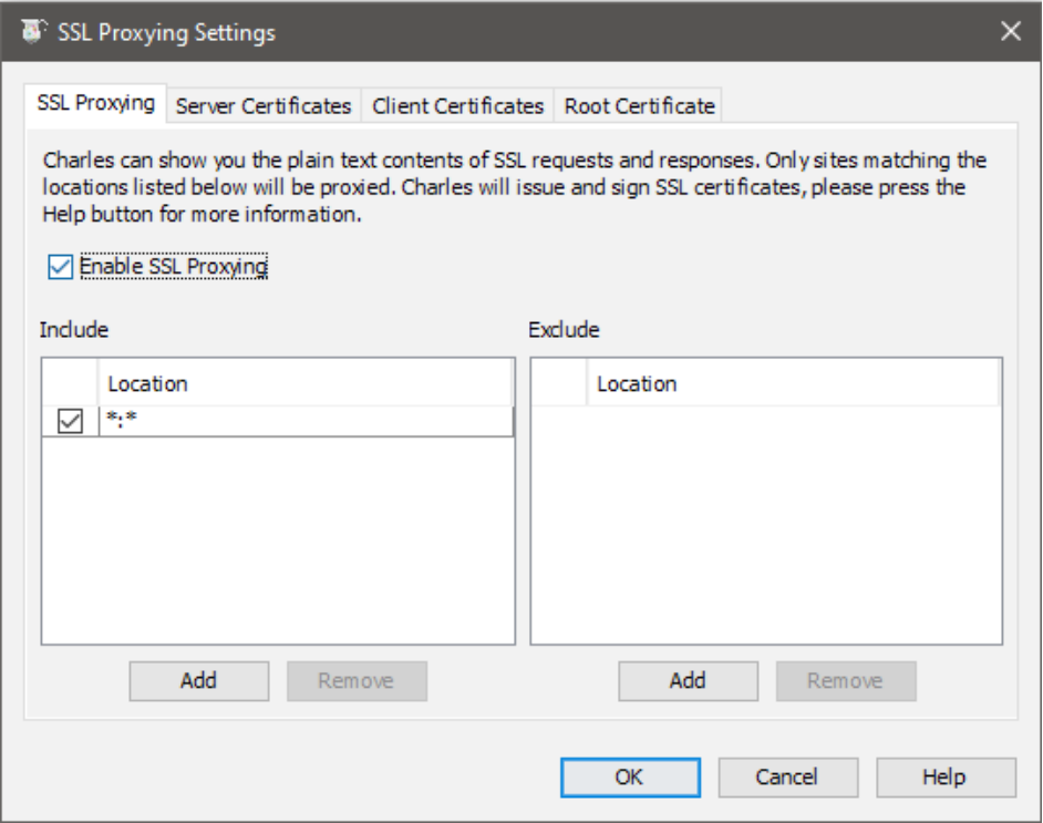 菜单:Proxy >> SSL Proxying Settings >> 如果我们需要捕获 SSL 链接需要添加如下配置,设置需要捕获那些站点的请求,这里我们写全部。