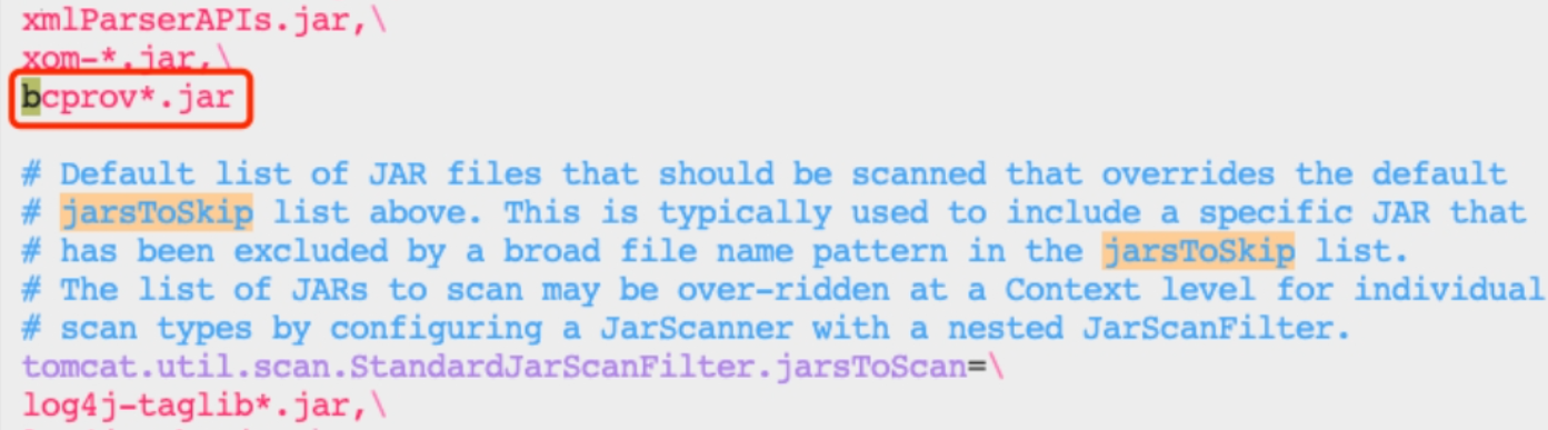 错误信息 org.bouncycastle.asn1.ASN1EncodableVector 在这个类上,因为tomcat启动的时候扫描jar,这个类是出现在bcprov.jar这个包。所以在tomcat的conf目录里面catalina.properties的文件中,在tomcat.util.scan.StandardJarScanFilter.jarsToSkip=里面加上bcprov*.jar过滤扫描这个包。