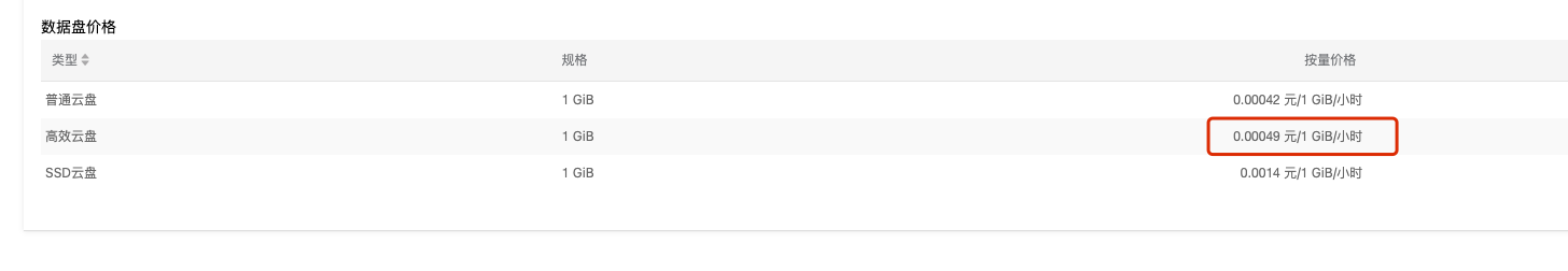 高效云盘单价:0.00049 元/1 GiB/小时